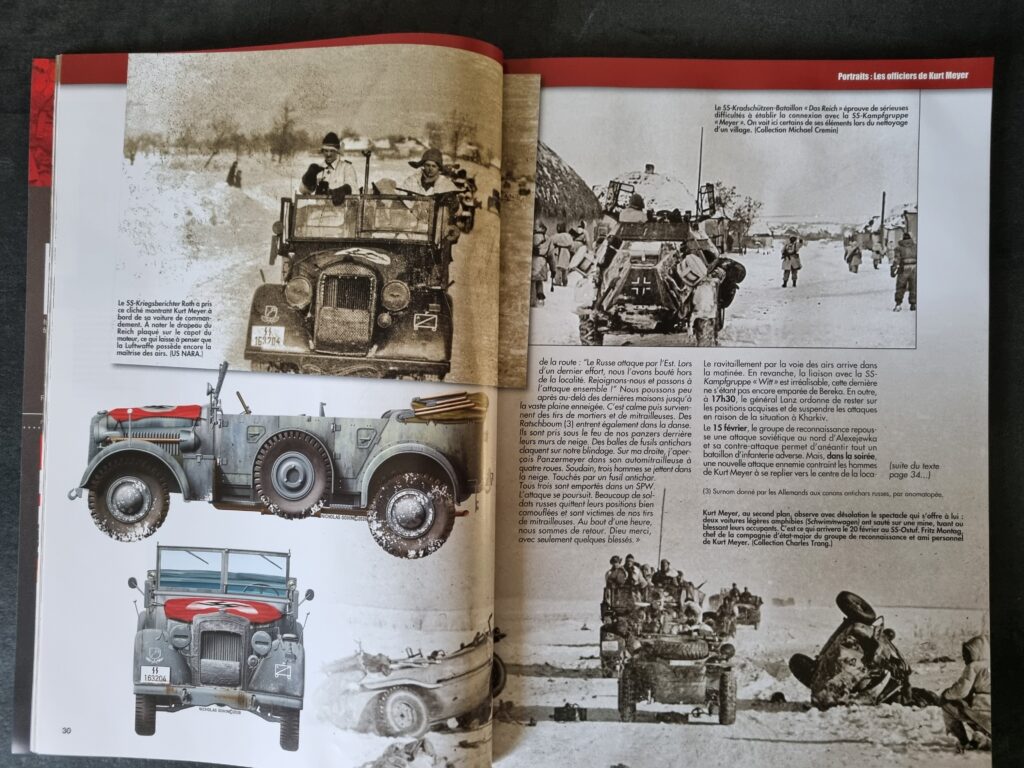 Outre les habituels clichés et portraits, l’article propose deux profils couleurs signés Nicholas GOHIN représentant la voiture de commandement de Kurt MEYER et un Panzer IV Ausf. G de la SS-Panzergrenadier-Division Leibstandarte SS Adolf Hitler.