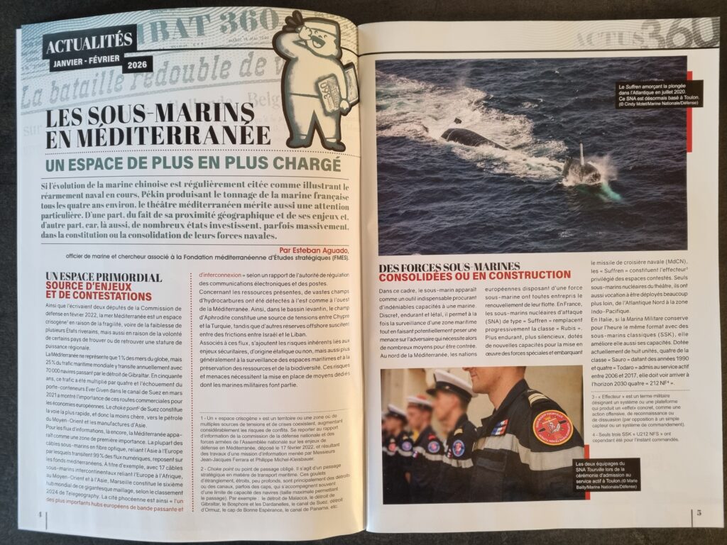 Sur le fond, ce numéro inaugural de Combat 360 s’articule autour de quatre articles. Le premier propose un panorama des forces sous-marines contemporaines en Méditerranée, dans un contexte géopolitique marqué par la multiplication des tensions et des menaces. L’article est enrichi par une carte sur deux pleines pages, particulièrement bienvenue, qui présente les forces navales des pays riverains tout en soulignant l’évolution de leur tonnage entre 2008 et 2030.