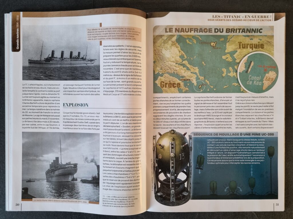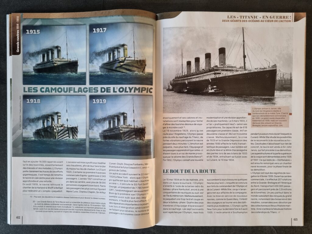 Les trois autres contributions portent sur les deux conflits mondiaux. La première s’intéresse au Coastal Command, notamment au début du conflit et durant la bataille de l’Atlantique. L’approche se veut principalement analytique et macroscopique. La seconde retrace le parcours des sister-ships du Titanic, l’Olympic et le Britannic dont on suit les parcours plus ou moins chaotiques, parfois tragiques. On notera des détails intéressants sur la construction et la mutualisation des moyens entre les trois navires de la classe. Le troisième revient enfin sur les cuirassés et croiseurs de la Kriegsmarine, de l’Entre-deux-guerres à la Seconde Guerre mondiale. Ce dernier se veut également analytique. Il part de la situation à l’issue de la Première Guerre mondiale, un bilan, évidemment insatisfaisant, où les sous-marins pèsent bien plus lourd que les quelques grosses unités navales.