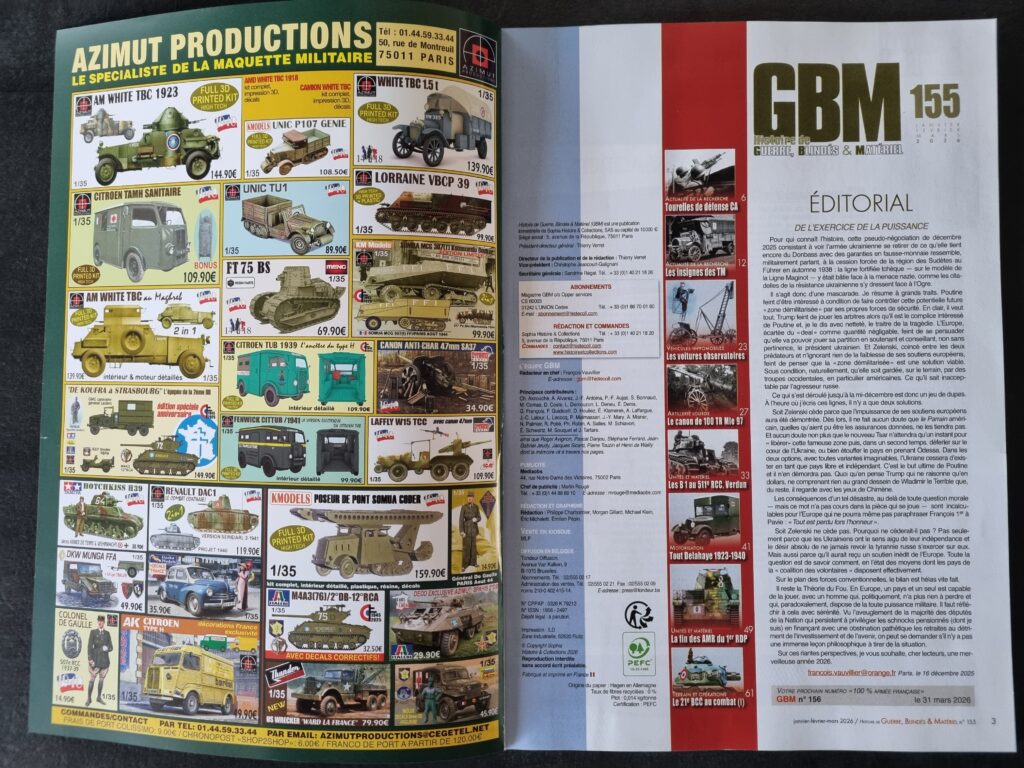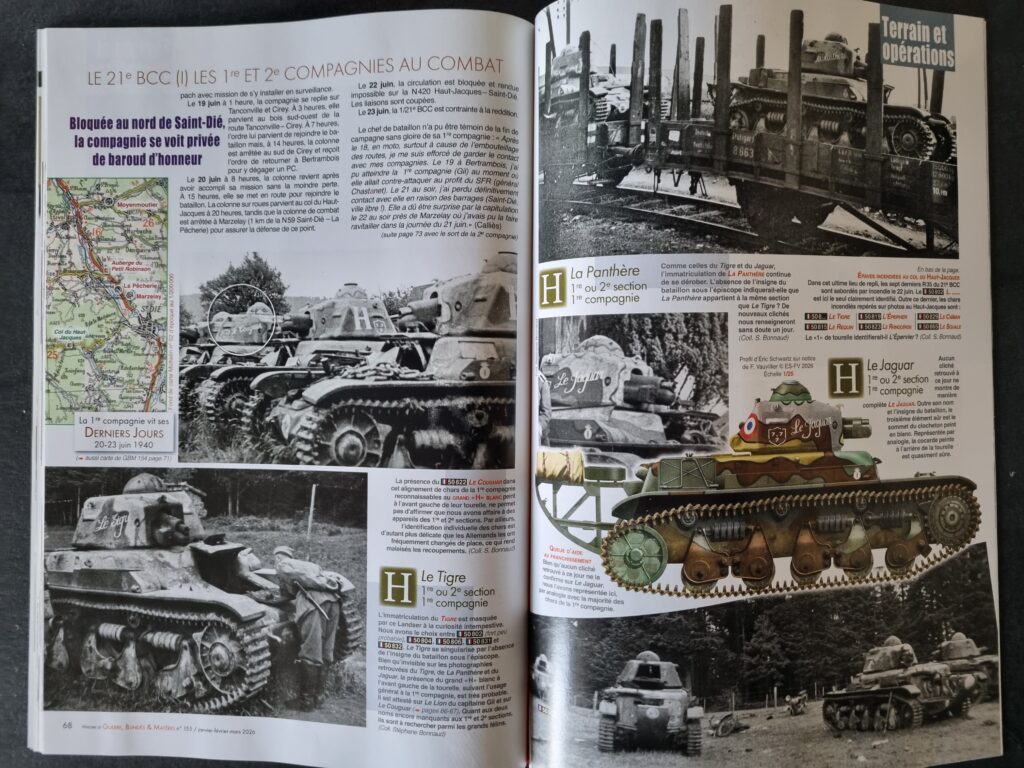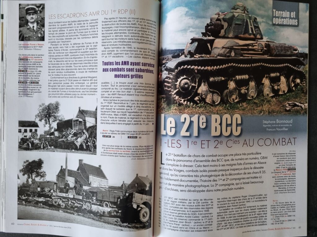 Enfin, Stéphane BONNAUD entame l’historique du 21ᵉ Bataillon de Chars de Combat (BCC), équipé de chars Renault R35. Fidèle à la ligne éditoriale de GBM, le texte se distingue par sa précision et s’accompagne d’une iconographie abondante et souvent inédite — photographies et profils couleurs — permettant une identification détaillée, engin par engin.