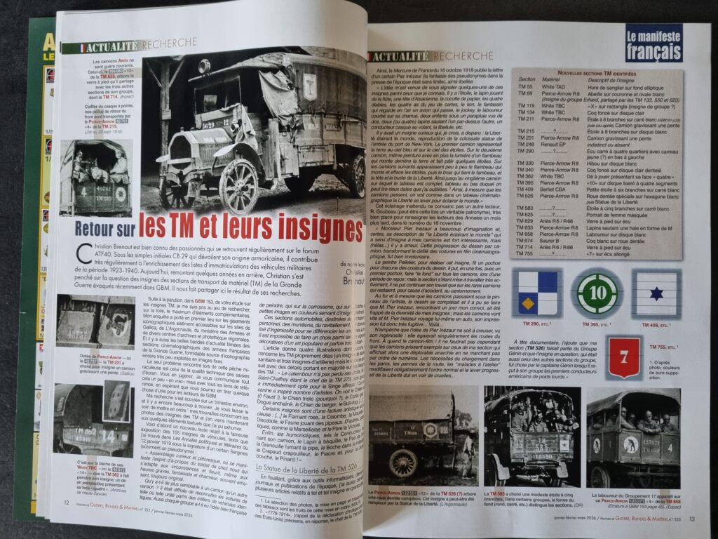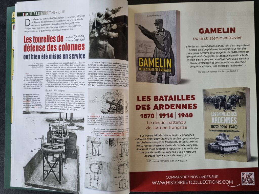Le premier est signé Mathieu COMAS. En écho au numéro précédent, il propose — en s’appuyant sur un travail conduit avec Pascal DANJOU, aujourd’hui disparu — une étude approfondie consacrée aux tourelles françaises de défense antiaérienne. Ces dispositifs, permettant d’installer une ou deux mitrailleuses sur une plateforme circulaire offrant un champ de tir à 360°, illustrent les efforts d’adaptation de l’armée française. La 345ᵉ CACC perçoit ainsi quatre exemplaires de ces tourelles, dont l’usage et les caractéristiques sont précisément détaillés.