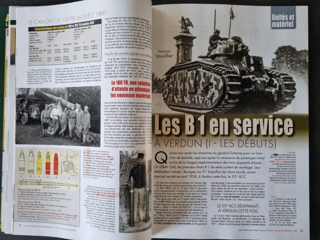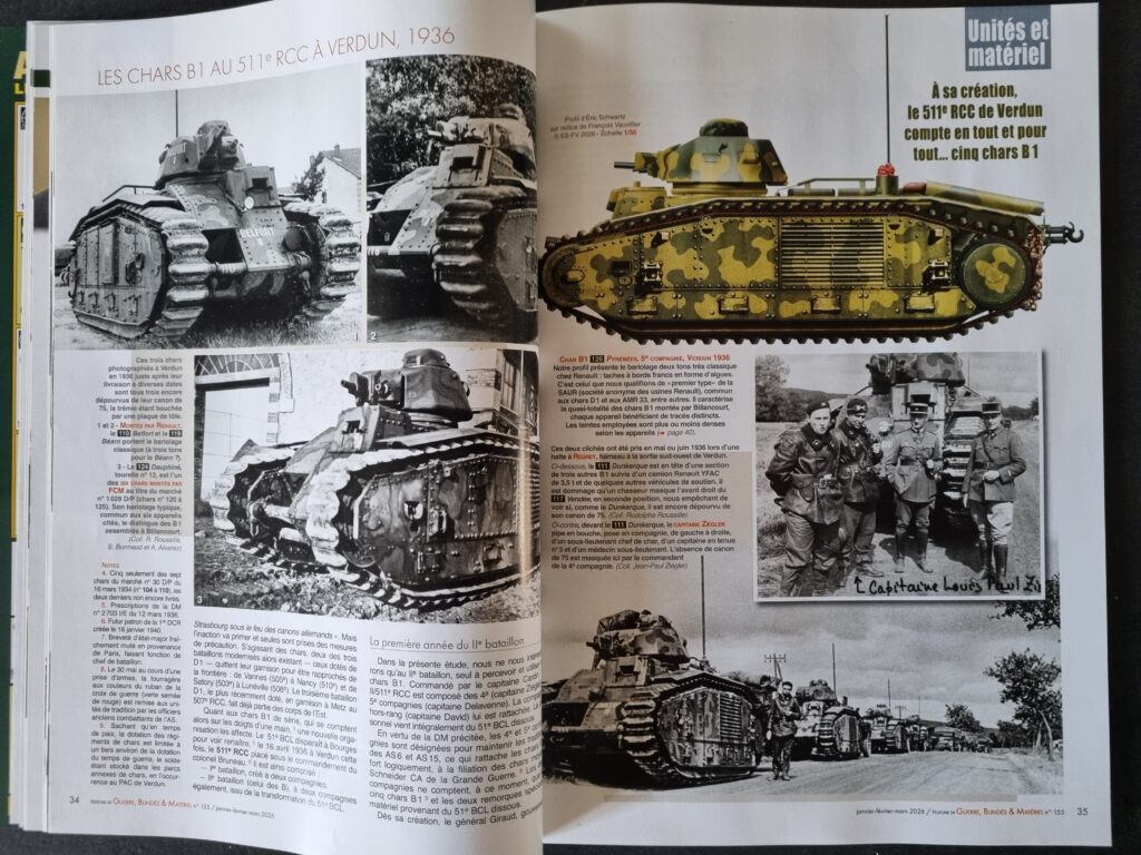 Près de la moitié du numéro se concentre sur l’armée française de 1940 et, plus particulièrement, sur ses unités blindées. Le dossier s’ouvre sur les débuts des chars B1 à Verdun, au sein du 511ᵉ Régiment de Chars de Combat, qui perçoit ses premiers engins dès 1936.