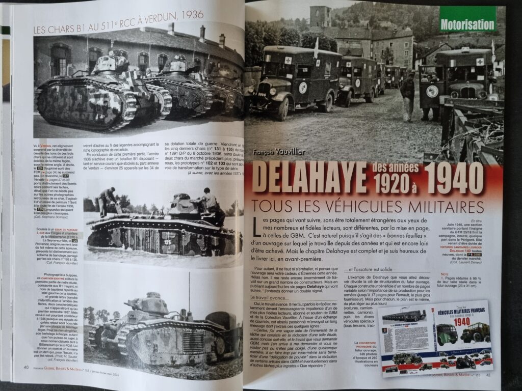 Cette tension entre spécialisation des matériels et impératifs de rationalisation industrielle se retrouve naturellement avec l’essor de la motorisation. À ce titre, François VAUVILLIER lève le voile sur son futur ouvrage, Tous les véhicules militaires français des années vingt à 1940. Le projet fait écho à son titre de référence, Tous les blindés de l’armée française, des origines à 1940. Les pages consacrées aux véhicules Delahaye, présentées ici en avant-première, reprennent une mise en page familière aux lecteurs de la revue et des ouvrages de la Collection Vauvillier.