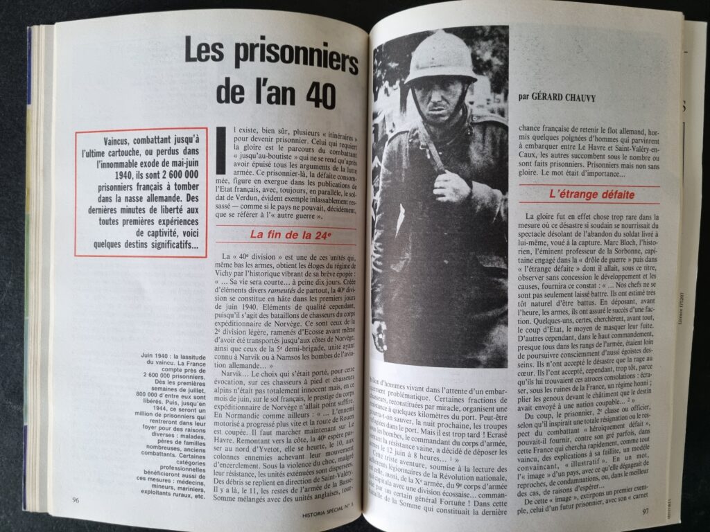 Gérard CHAUVY se penche sur le sort des prisonniers français à partir de témoignages. Le numéro propose par ailleurs le récit d’une lycéenne et un article sur la grande peur de l’exode, décrite comme l’expression du désarroi face à la carence des élites politiques et sociales et comme le fondement moral de l’armistice.