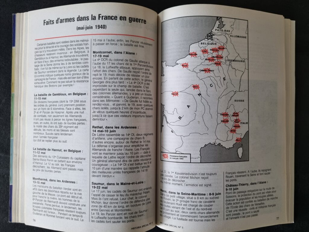 Une double page présente les faits d’armes dans la France en guerre de mai et juin 1940, avec une carte de localisation à l’échelle de l’hexagone.