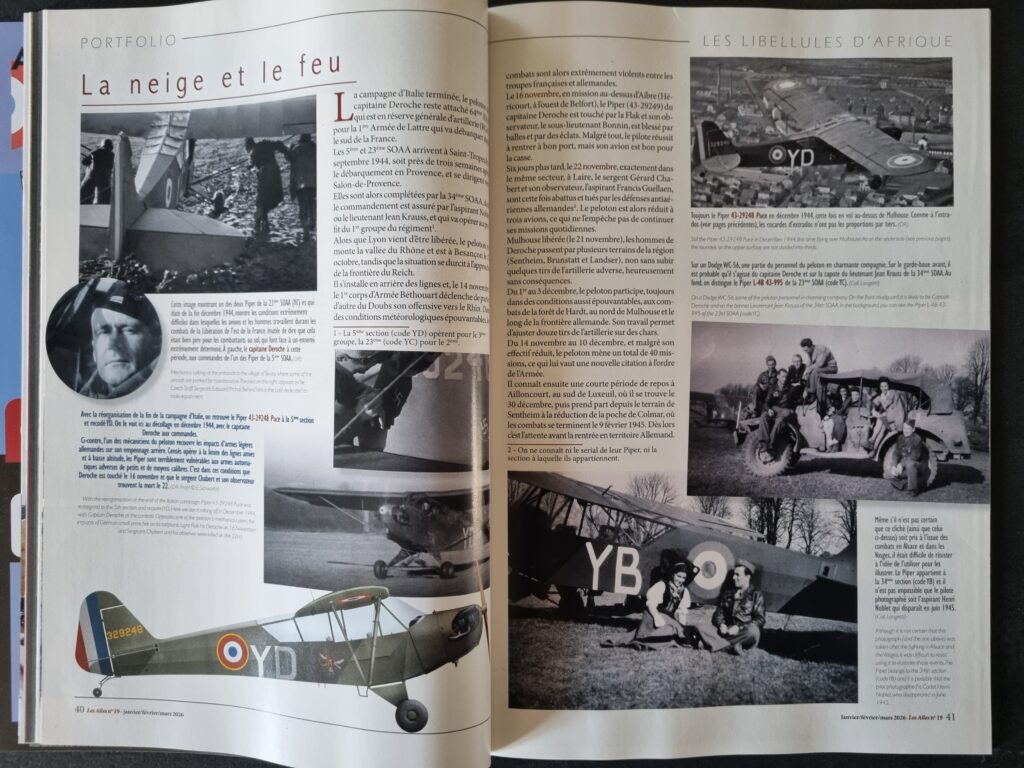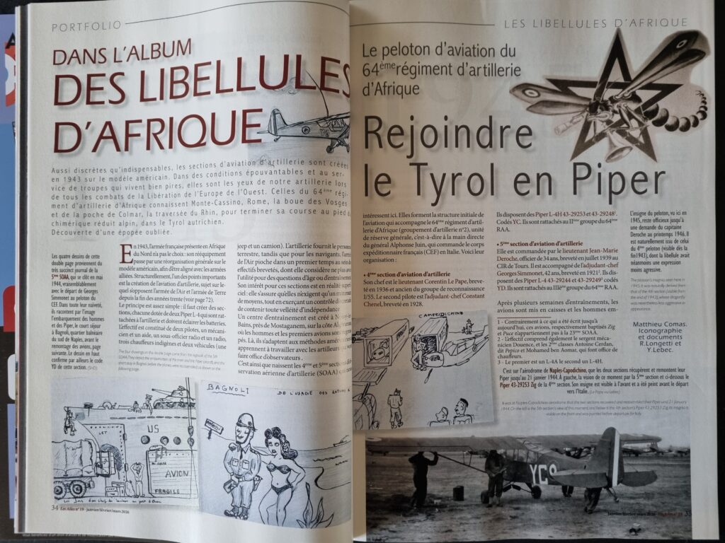 L’un des ensembles les plus originaux du numéro demeure cependant dans l’album des libellules d’Afrique. Les quelques croquis issus d’un journal de marche attirent immédiatement l’attention. Outre cet aspect iconographique, l’article éclaire un aspect largement méconnu du renouveau des armées françaises sous inspiration américaine : celui des sections d’aviation d’artillerie, dont l’itinéraire relie l’Italie, la Provence, l’Alsace puis l’Autriche. Cette approche, qui évoque par certains aspects l’esprit de Militaria Magazine, permet de découvrir un sujet étonnant, loin des récits plus classiques centrés sur l’aviation de combat. Cette rétrospective des principaux engagements auxquels participent les 4e, 5e, 23e et 34e SOAA permet de comprendre le développement de l’aviation dans l’utilisation de l’artillerie afin de mieux régler les tirs.