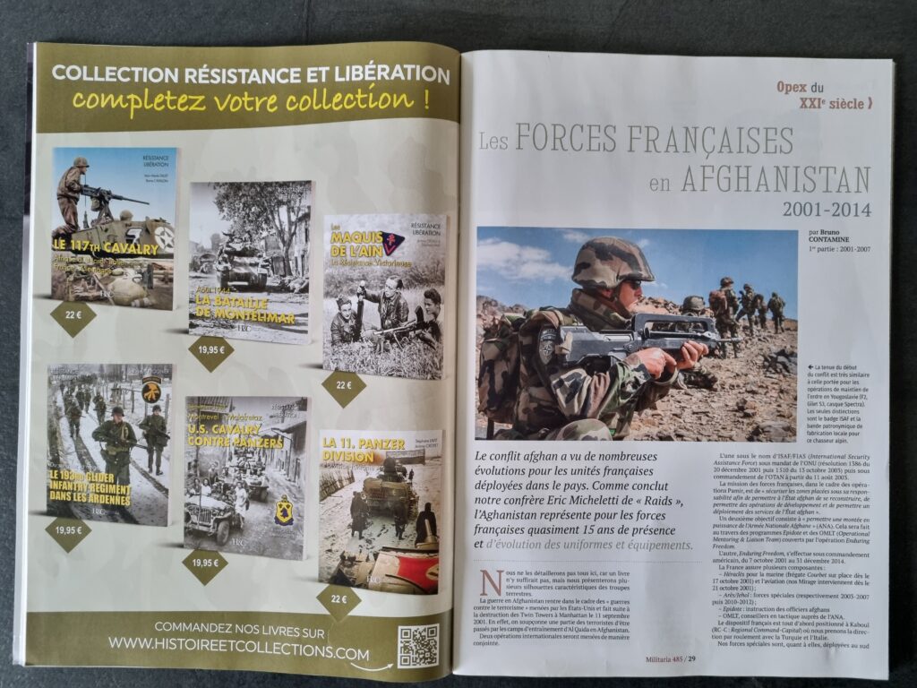 L’article qui fait la couverture du numéro constitue le pivot du n°485. Il porte sur l’évolution des tenues françaises en Afghanistan de 2001 à 2014, dans le prolongement des attentats du 11 septembre aux États-Unis.
