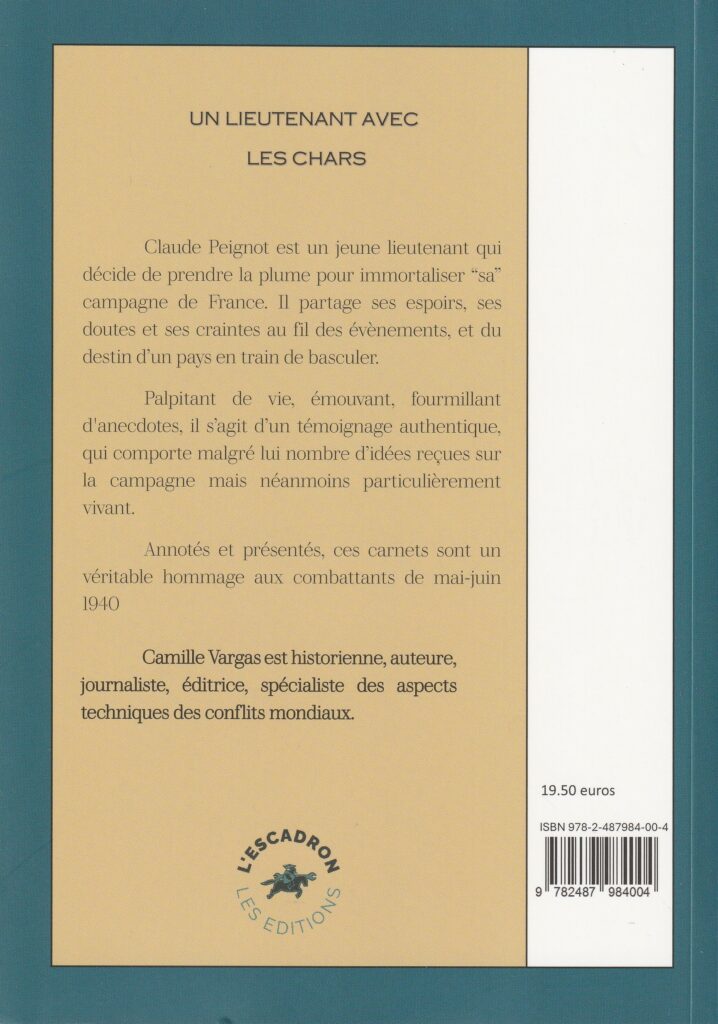 En choisissant de publier Un lieutenant avec les chars, Camille VARGAS inaugure sa maison d’édition avec un texte à forte valeur documentaire. Le récit repose sur les carnets du lieutenant Claude PEIGNOT, officier affecté à la 1re Division Cuirassée (DCR), blessé durant les combats et qui n’envisageait pas initialement une diffusion publique de ses souvenirs. Conservé dans la sphère familiale durant des décennies, le manuscrit trouve enfin une forme éditoriale.